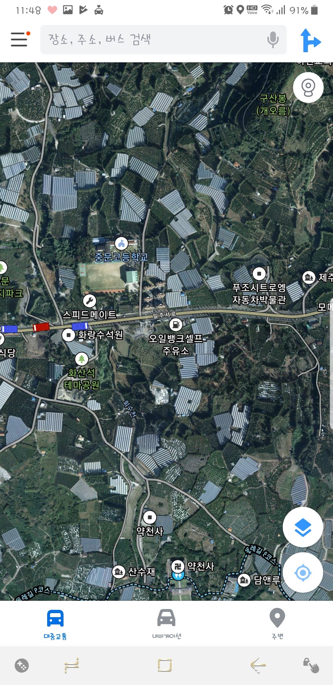 여기서 지도설정 -> 지도+스카이뷰 -> 제주버스 아이콘을 눌러주면