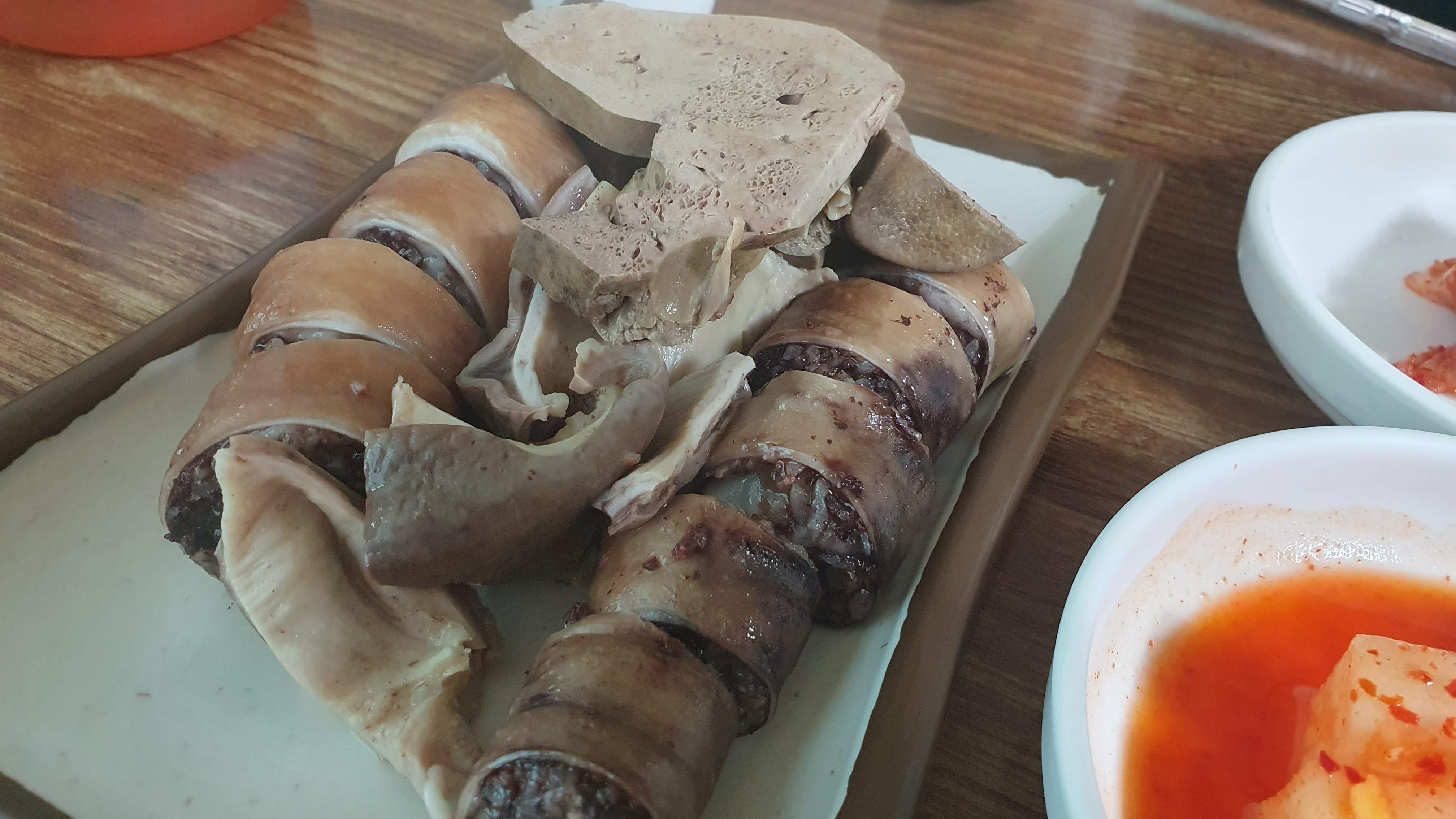 드디어 영접한 순대한접시입니다. 저는 요리에 대해 잘 모르지만 추측하기로는 찹쌀이 들어간것 같고 순대피는 오징어? 문어?로 만들어진듯 합니다.(확인해보니 순대피는 막창인것 같네요...^^;;;;) 저번에 못먹었으니 이날에는 정말 더 맛있게 잘 먹은것 같습니다.